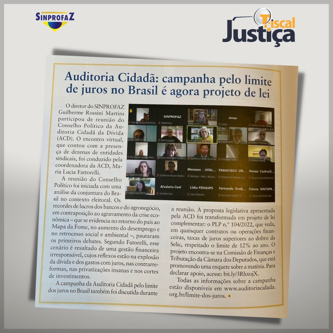 A edição de dezembro de 2022 da revista Justiça Fiscal, do Sindicato Nacional dos Procuradores da Fazenda Nacional (Sinprofaz), traz em seu conteúdo a divulgação da Campanha pelo Limite dos Juros, que conta com o apoio de dezenas de importantes entidades da sociedade civil, inclusive o SINPROFAZ, que esteve presente no lançamento da campanha e cujo diretor, Guilherme Rosini Martins, participou na reunião virtual do Conselho Político da Auditoria Cidadã da Dívida (ACD).