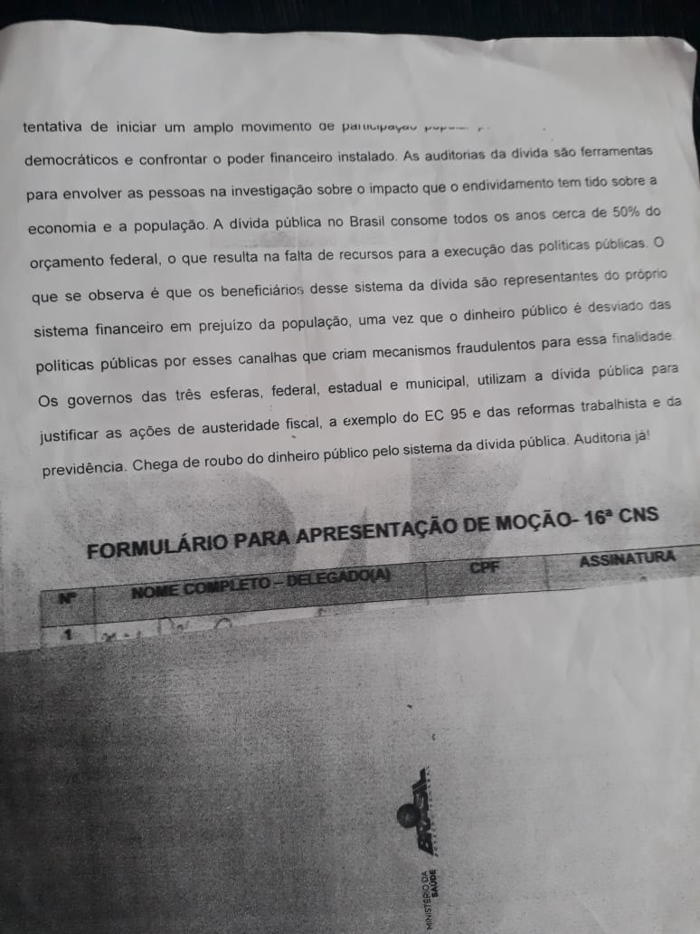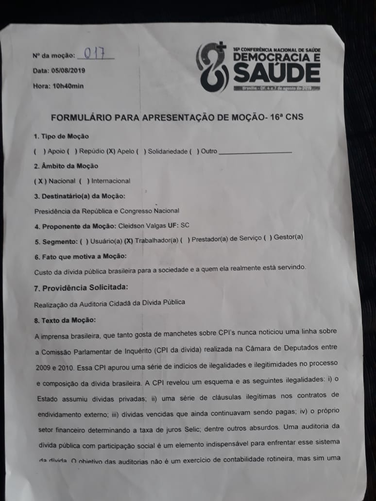 Moção para realização da Auditoria Cidadã da Dívida Pública aprovada na 16ª Conferência Nacional de Saúde