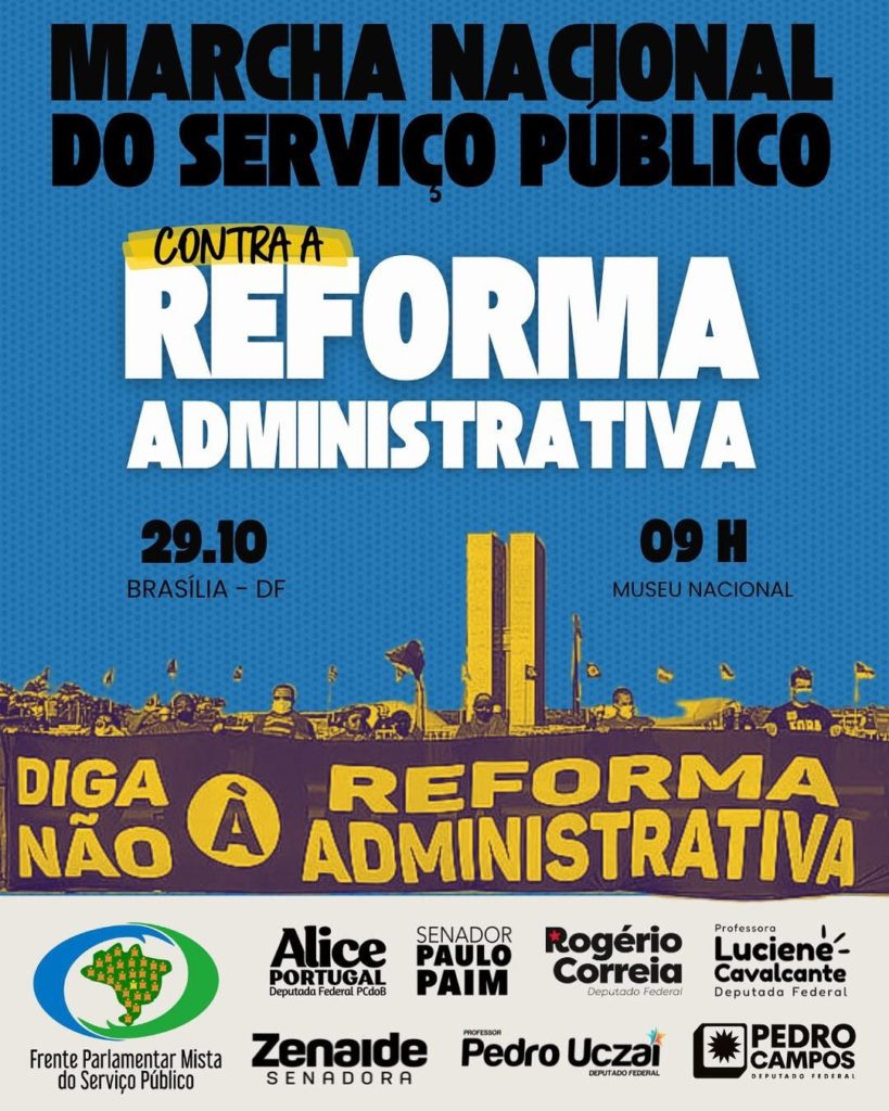 No dia 29 de outubro, às 9h, no Museu Nacional, vamos juntos na Marcha Nacional do Serviço Público dizer um grande NÃO à Reforma Administrativa!