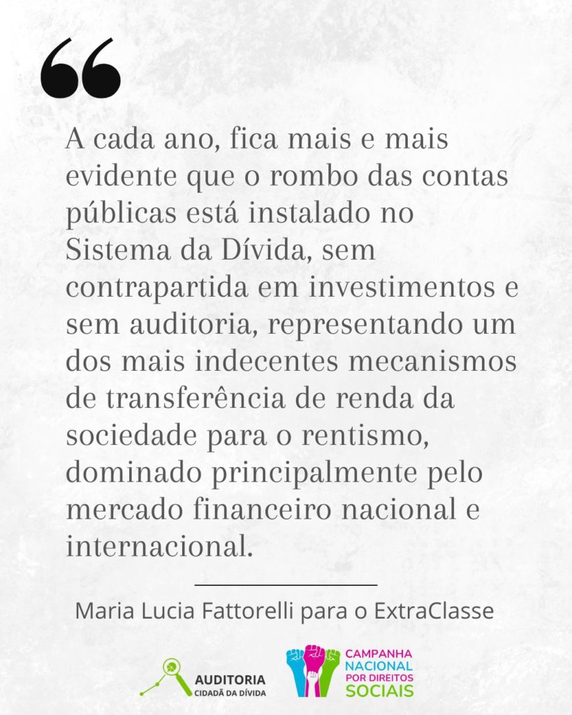 Em seu texto publicado pelo ExtraClasse, a coordenadora nacional da ACD conclui que fica cada vez mais evidente que o rombo das contas públicas está instalado no Sistema da Dívida, que é dominado pelo mercado financeiro nacional e internacional.