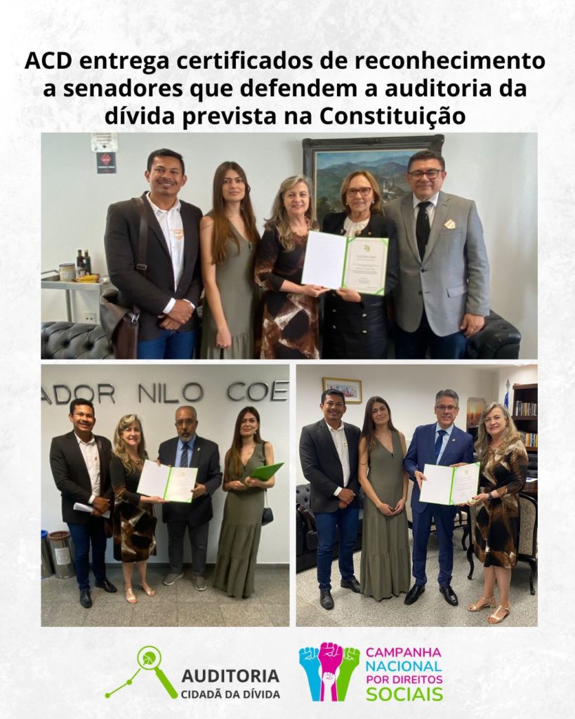 A Auditoria Cidadã da Dívida entregou certificados de reconhecimento à senadora Zenaide Maia e aos senadores Alessandro Vieira e Paulo Paim, em reconhecimento ao histórico posicionamento em defesa do cumprimento da Constituição Federal, no que diz respeito à realização da auditoria da dívida pública no Brasil, com participação social.