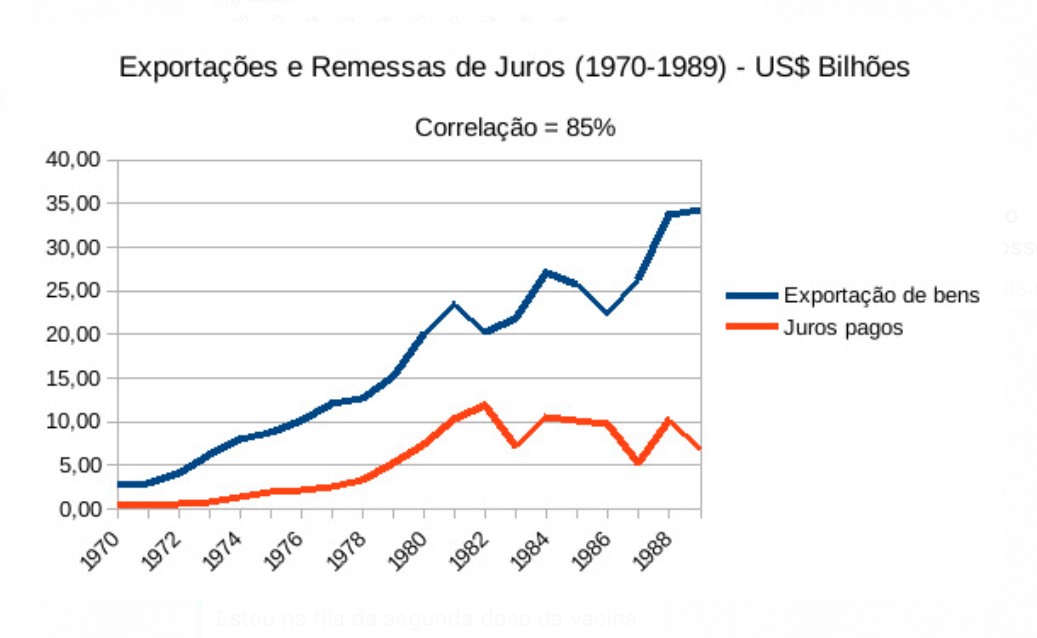 No período de 1970 a 1989, quando se verificou aumento exponencial da dívida externa ilegítima e, consequentemente, elevação do volume de pagamento de juros ao exterior, o crescimento das exportações (que compreendiam principalmente as commodities) serviu para que o país obtivesse os dólares necessários a esse pagamento, conforme mostra a relação direta, em correlação que atinge 85% na comparação entre as exportações e as remessas de juros ao exterior: