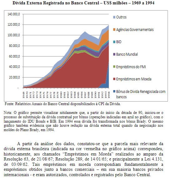 É fundamental compreender o processo histórico ilegítimo da dívida externa, porque toda aquela dívida externa obscura da ditadura (sem comprovação da maior parte de seu estoque, como mostrou a CPI) foi transferida, juntamente com dívidas do setor privado, para a responsabilidade do Banco Central na década de 80, e, na década de 90, apesar de graves suspeitas de prescrição dessa dívida externa junto a bancos privados internacionais, ela foi transformada em novos títulos, no questionável Plano Brady. E a partir daí, além da aceitação desses títulos Brady como moeda na insana privatização de empresas estatais, houve sucessivas transformações em dívida interna, de tal forma que essa dívida ilegítima vem impactando as contas públicas até hoje, e durante todos esses anos, a sangria de recursos para pagamento de juros tem sido imensa.