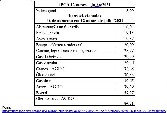 A tabela seguinte mostra o expressivo aumento percentual de preços de alguns dos itens que mais impactaram no índice geral de inflação IPCA calculado pelo IBGE para os últimos 12 meses, até julho/2021:
