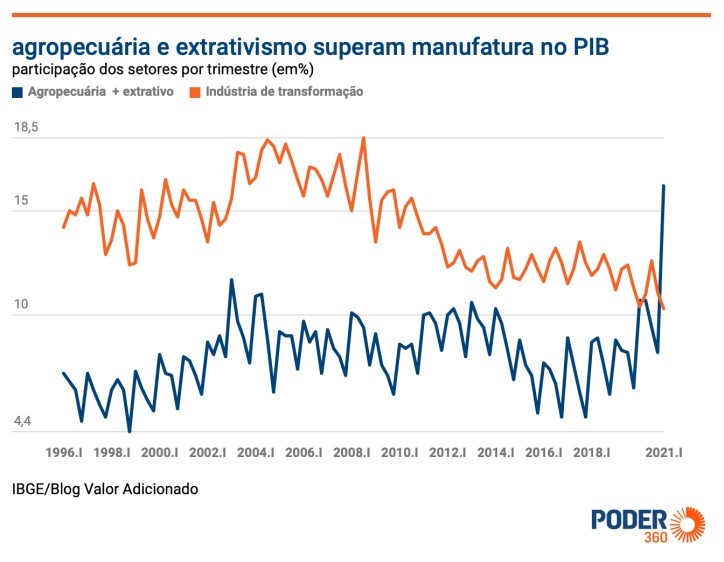 Na verdade, a inflação de alimentos decorre do modelo primário-exportador, e não de um suposto “excesso de moeda” ou “demanda aquecida”, como alega o Banco Central para justificar o lesivo aumento de juros. Por sua vez, os juros altos amarram toda a economia e dificultam cada vez mais a sobrevivência das pequenas e médias empresas, assim como das indústrias, empurrando o país para a reprimarização dos tempos coloniais, como evidenciam os dados do IBGE retratados em gráfico divulgado pelo Poder360[xv]