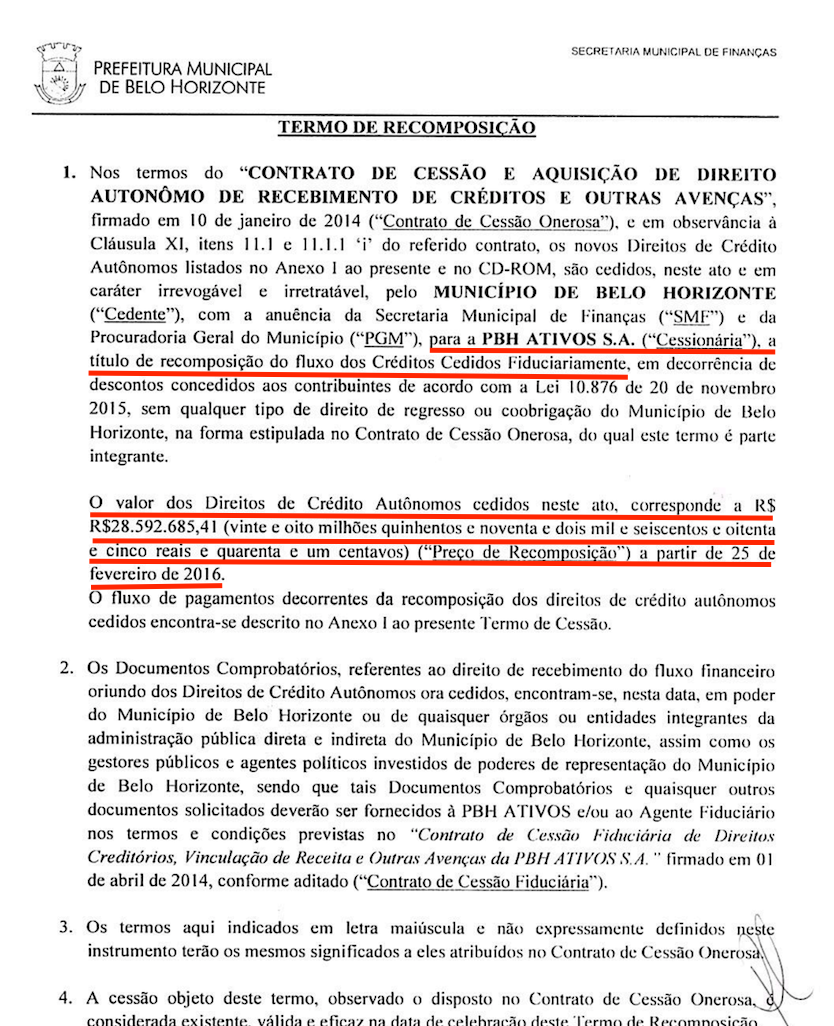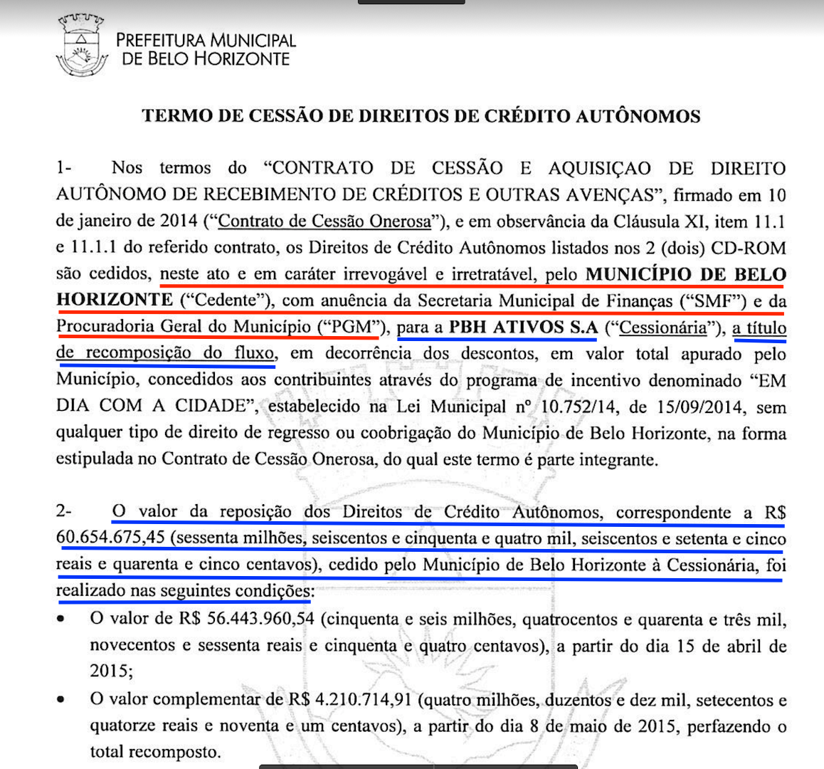 8. Atente-se para o fato de o Município de Belo Horizonte ter-se obrigado a efetuar, em caráter irrevogável e irretratável, a recomposição do valor do fluxo de arrecadação de créditos tributários, fiduciariamente alienado à instituição financeira que adquiriu as debêntures sênior (banco BTG Pactual S/A). Durante o seu percurso pela rede bancária e antes de alcançar os cofres públicos, esse fluxo financeiro passou a ser desviado para as “contas vinculadas” a essa arquitetura financeira, de gestão exclusiva das instituições financeiras envolvidas na operação. O “Termo de Cessão de Direitos de Crédito Autônomos”, de 18/05/2015, acompanhado de planilhas de valores que detalham as parcelas, comprova a realização de uma RECOMPOSIÇÃO DE VALORES no montante de R$ 60.654.675,45 (sessenta milhões, seiscentos e cinquenta e quatro mil, seiscentos e setenta e cinco reais e quarenta e cinco centavos), conforme trecho ilustrativo a seguir: (vide documento completo em: https://drive.google.com/file/d/0B8OTOor5lxGDbjNVM1NQSDVBQlk/view?resourcekey=0-V9RFJ6SLB6X2MZsDNa4Ugg)