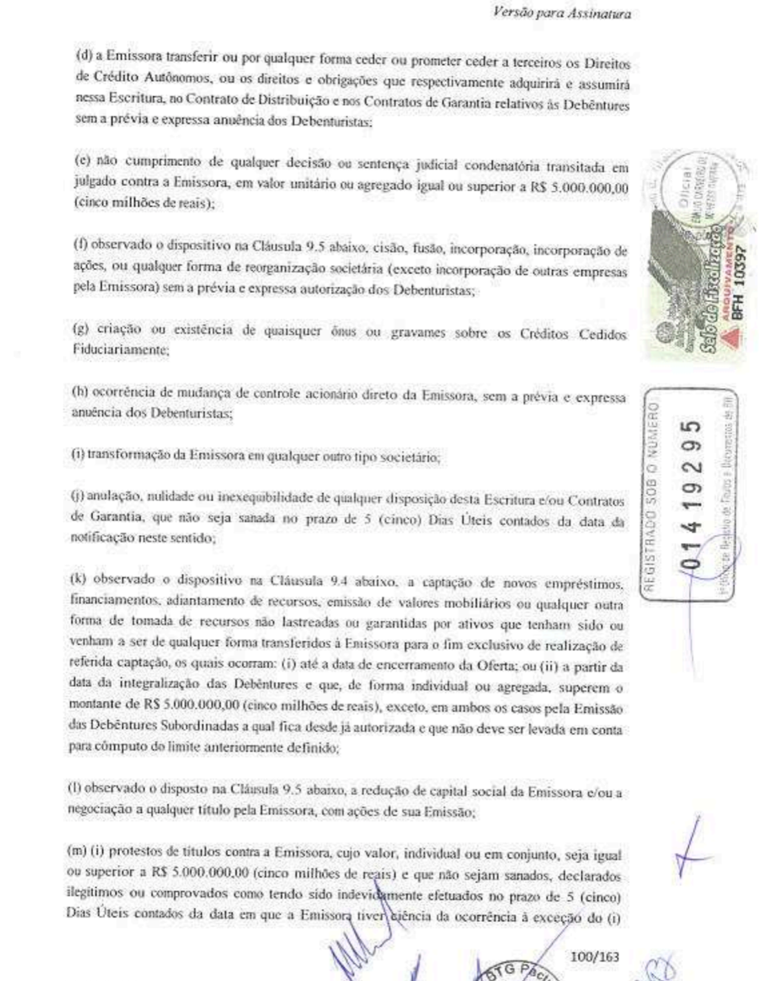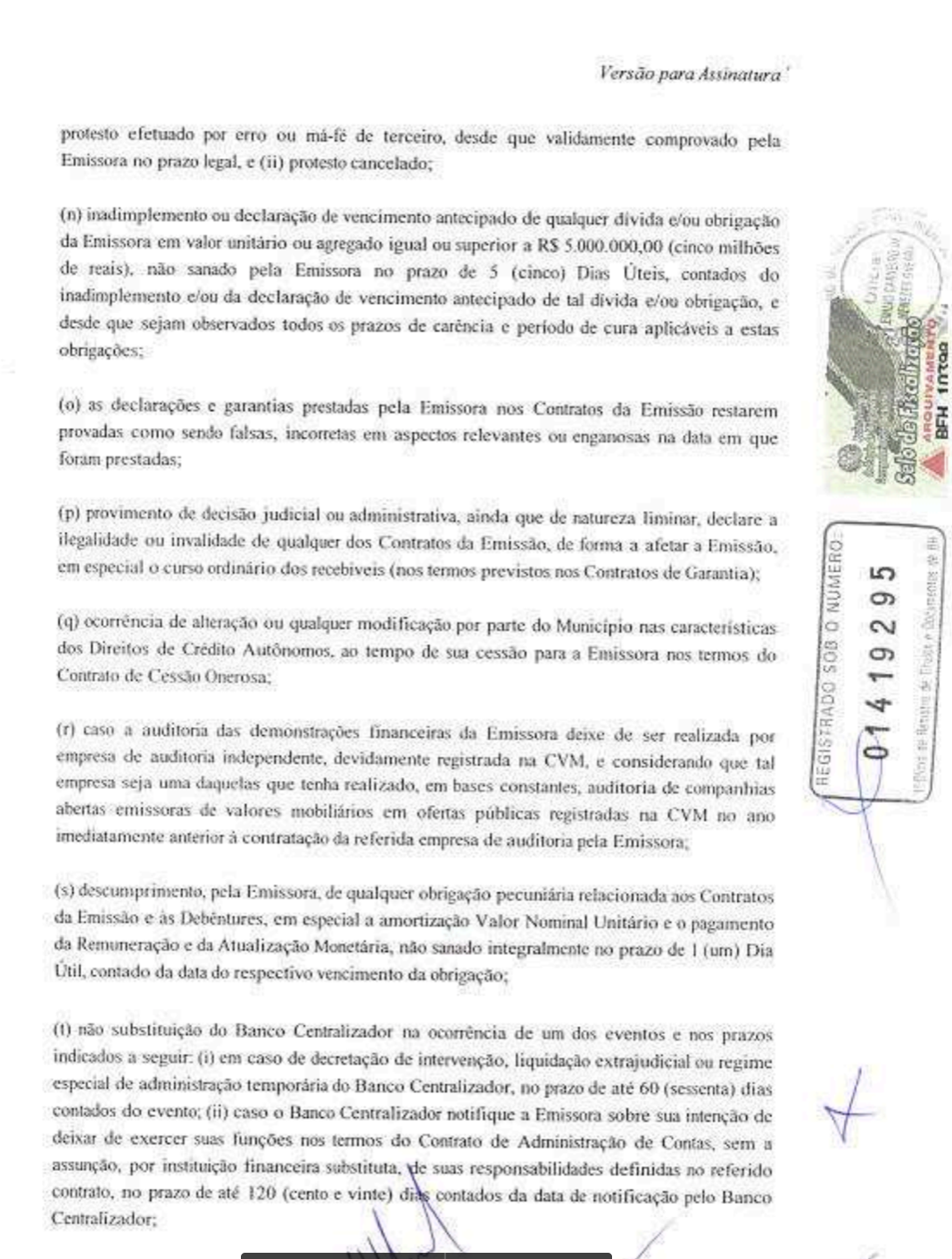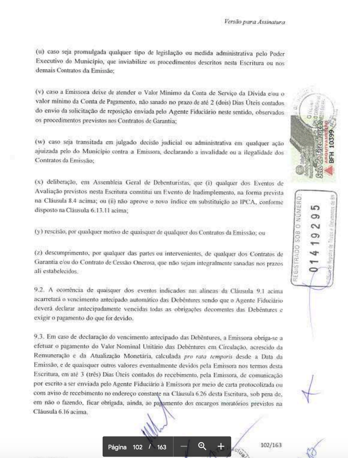13. A Cláusula 9 (9.1 a 9.6) da Escritura de Emissão das Debêntures com Garantia Real (Anexo H do documento denominado Contrato de Cessão e Aquisição de Direito Autônomo de recebimento de crédito e outras Avenças), disponível em https://auditoriacidada.org.br/wp-content/uploads/2024/05/Contrato-de-Cessao-Onerosa_registrado-RTD-BH.pdf e https://drive.google.com/file/d/0B2C5anVcaxp5SVVEOXhlNWlOdDQ/edit?resourcekey=0-BOCpHMxnI9PkB8XjeIRYJg , páginas 99/163 a 103/163 do PDF, é um verdadeiro tratado de rendição do Município ao referido contrato, prevendo antecipação do vencimento das debêntures e todos os respectivos encargos, caso se verifique qualquer um dos fatos elencados nas letras “a “ a “z”, assumindo, mais uma vez, o Município de Belo Horizonte, a completa garantia da operação, tendo em vista que todos os pagamentos das debêntures sênior são efetuados com recursos do fluxo de arrecadação fiduciariamente alienado ao investidor que adquiriu as debêntures sênior: