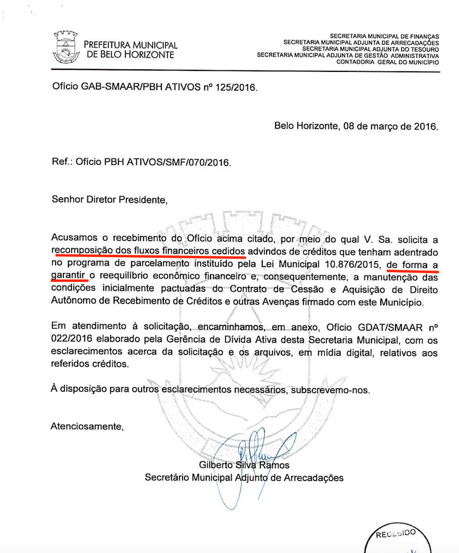 9. Da mesma forma, outra RECOMPOSIÇÃO DE FLUXO DE ARRECADAÇÃO TRIBUTÁRIA, no valor de R$ 28.592.685,41 (vinte e oito milhões, quinhentos e noventa e dois mil, seiscentos e oitenta e cinco reais e quarenta e um centavos), feita em 25/02/2016, está comprovada no (a) Ofício GAB-SMAAR/PBH ATIVOS no 125/2016, de 08/03/2016, (b) no Ofício GDAT/SMAAR no 22/2016, de 07/03/2016 (ambos disponíveis em: https://drive.google.com/file/d/0B8OTOor5lxGDdjNxaGM1N25fUEU/view?resourcekey=0-Gn_Wuuh7u8FBnGldPIR8qw) e (c) no TERMO DE RECOMPOSIÇÃO (disponível em: https://drive.google.com/file/d/0B8OTOor5lxGDRG9LS0N5VGdiY00/view?resourcekey=0-vxoR-nXGgy-wnTXuGBHXbg ), cujos trechos e partes a seguir ilustram, de forma inconteste, a garantia explícita assumida pelo Município de Belo Horizonte: