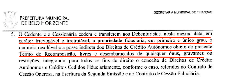 14.2. Considerando que, além da privilegiada alienação fiduciária de recursos públicos, acima citada, o Município de Belo Horizonte ainda se comprometeu com a recomposição do fluxo de arrecadação diante de qualquer eventualidade e, em qualquer caso, sem restrições;