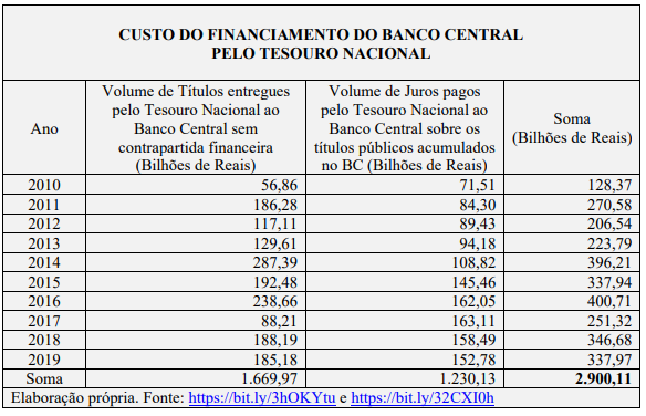 A principal receita auferida pelo Banco Central, conforme dados de seu balanço patrimonial, corresponde aos juros pagos pelo Tesouro Nacional, como explicado em recente artigo <https://auditoriacidada.org.br/conteudo/tesouro-gastou-quase-r-3-trilhoes-com-o-banco- central/> , o qual contém as fontes dos dados oficiais e tabela que mostra que o Tesouro Nacional gastou quase R$ 3 TRILHÕES com o Banco Central nos últimos 10 anos: