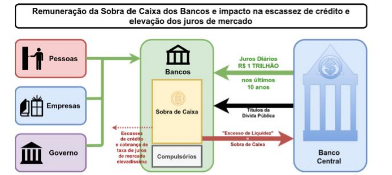 - não existe fato econômico que justifique essa remuneração parasita aos bancos, sobre quantia que sequer pertence a eles, mas corresponde aos depósitos e aplicações de toda a sociedade, e que deveria retornar a ela por meio de empréstimos a juros baixos;
