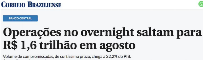 Em agosto/2020 o volume das “Operações Compromissadas”, que se equiparam ao antigo overnight, atingiram R$ 1,6 trilhão, quase 23% do PIB, e geram escassez de moeda na economia, empurrando os juros de mercado para os patamares altíssimos praticados no Brasil, o que prejudica o funcionamento de toda a economia.