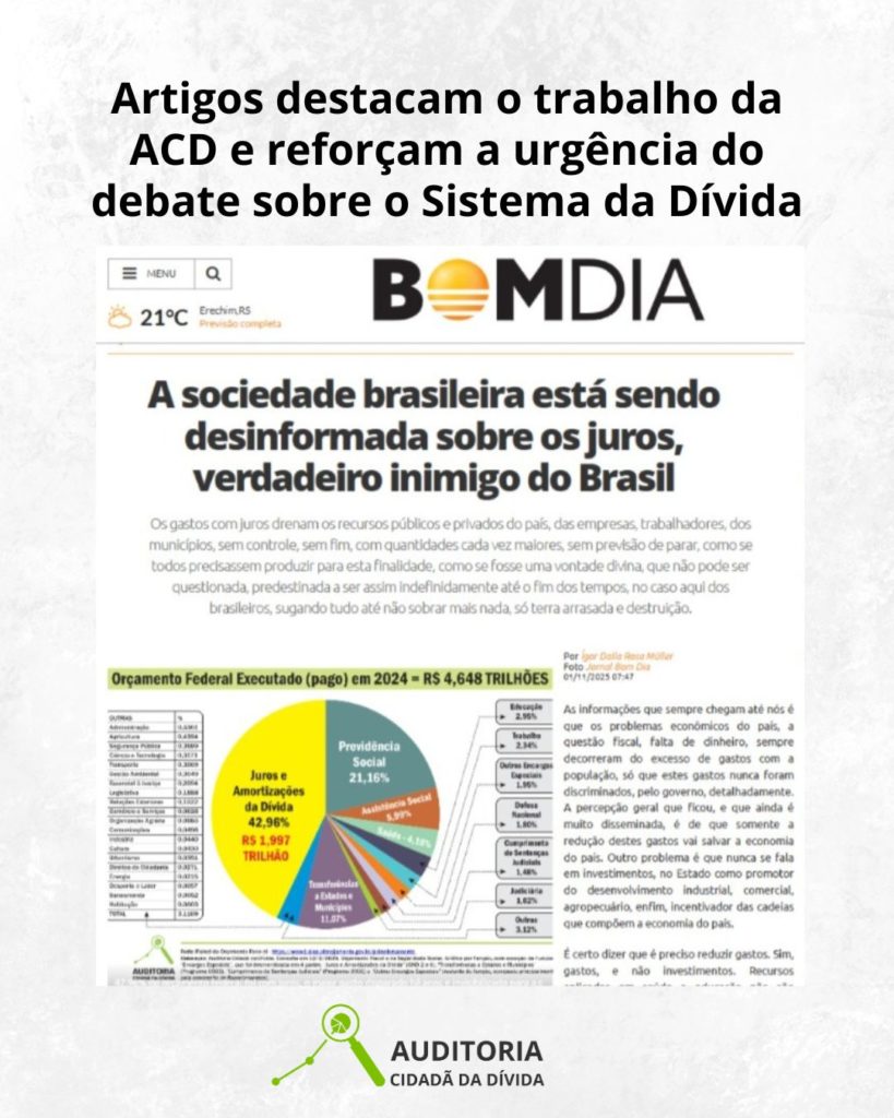 Já o Jornal Bom Dia publicou, em 1º de novembro, o artigo “A sociedade brasileira está sendo desinformada sobre os juros, verdadeiro inimigo do Brasil”, de autoria de Ígor Dalla Rosa Müller. O texto traz em destaque o gráfico do Orçamento Federal elaborado pela Auditoria Cidadã da Dívida, que evidencia o peso dos juros na execução orçamentária. O autor defende que o maior gasto público do país é justamente aquele que não gera contrapartida à sociedade: o pagamento de juros e amortizações da dívida, que consumiu 42,96% do orçamento federal de 2024, segundo dados oficiais compilados pela ACD.