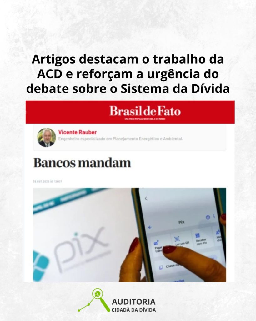 Dois artigos publicados recentemente na imprensa nacional repercutem dados e análises da Auditoria Cidadã da Dívida (ACD), reafirmando a relevância do trabalho desenvolvido pela organização no acompanhamento crítico do orçamento público e na denúncia do Sistema da Dívida — mecanismo que promove uma contínua e crescente subtração de recursos públicos, que são direcionados principalmente ao setor financeiro.