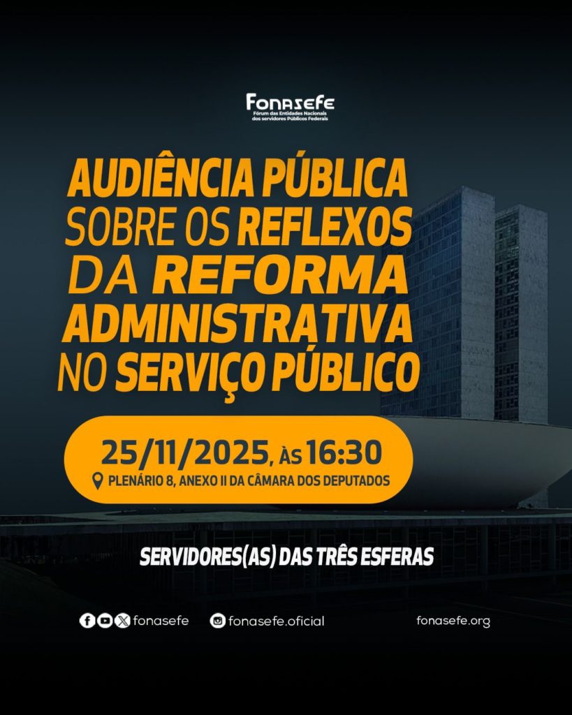 📣 No dia 25/11/2025, às 16:30, no Plenário 8, Anexo II da Câmara dos Deputados, teremos uma importante Audiência Pública para discutir os reflexos da Reforma Administrativa no Serviço Público.