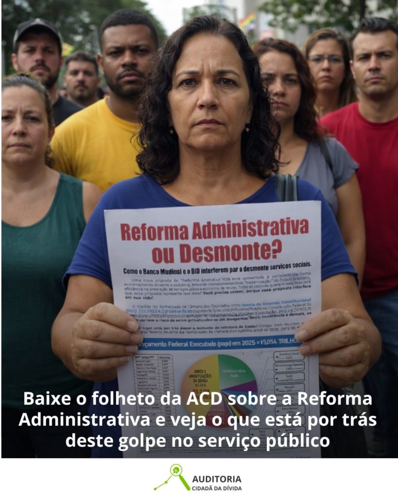 A chamada “Reforma Administrativa” é apresentada como modernização do Estado, mas o folheto da Auditoria Cidadã da Dívida revela um cenário bem diferente: trata-se de um projeto que pode desmontar serviços públicos essenciais e fragilizar o funcionalismo. A proposta (PEC 38/2025) abre caminho para privatizações, fim da estabilidade, redução de concursos e precarização de áreas como saúde, educação e assistência.