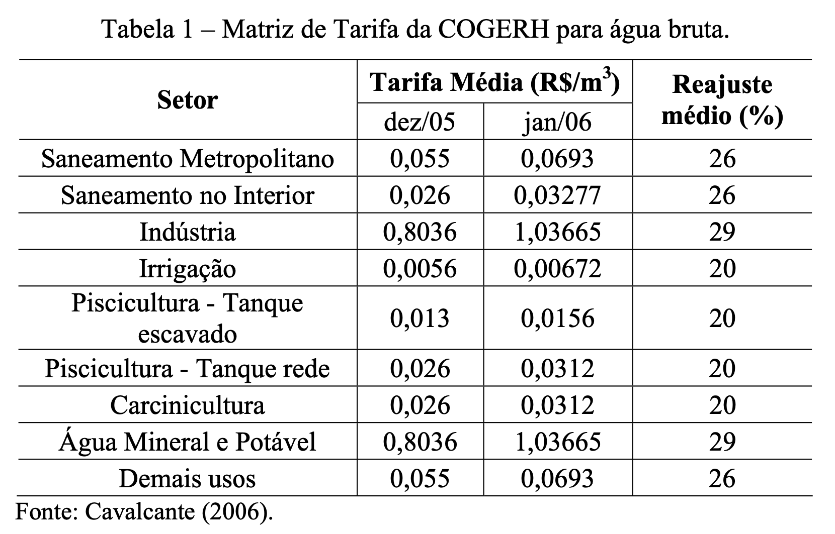 Importante estudo versa sobre a cobrança de água bruta no Estado do Ceará “COBRANÇA DE ÁGUA: Estudo Comparativo entre as Políticas de Cobrança no Estado do Ceará e na Bacia do Rio Paraíba do Sul” (disponível em https://repositorio.ufc.br/bitstream/riufc/10716/1/2007_eve_rosouza_cobranca.pdf ). Um dado que salta aos olhos é a diversificada matriz de preços que varia de acordo com a essencialidade da atividade: