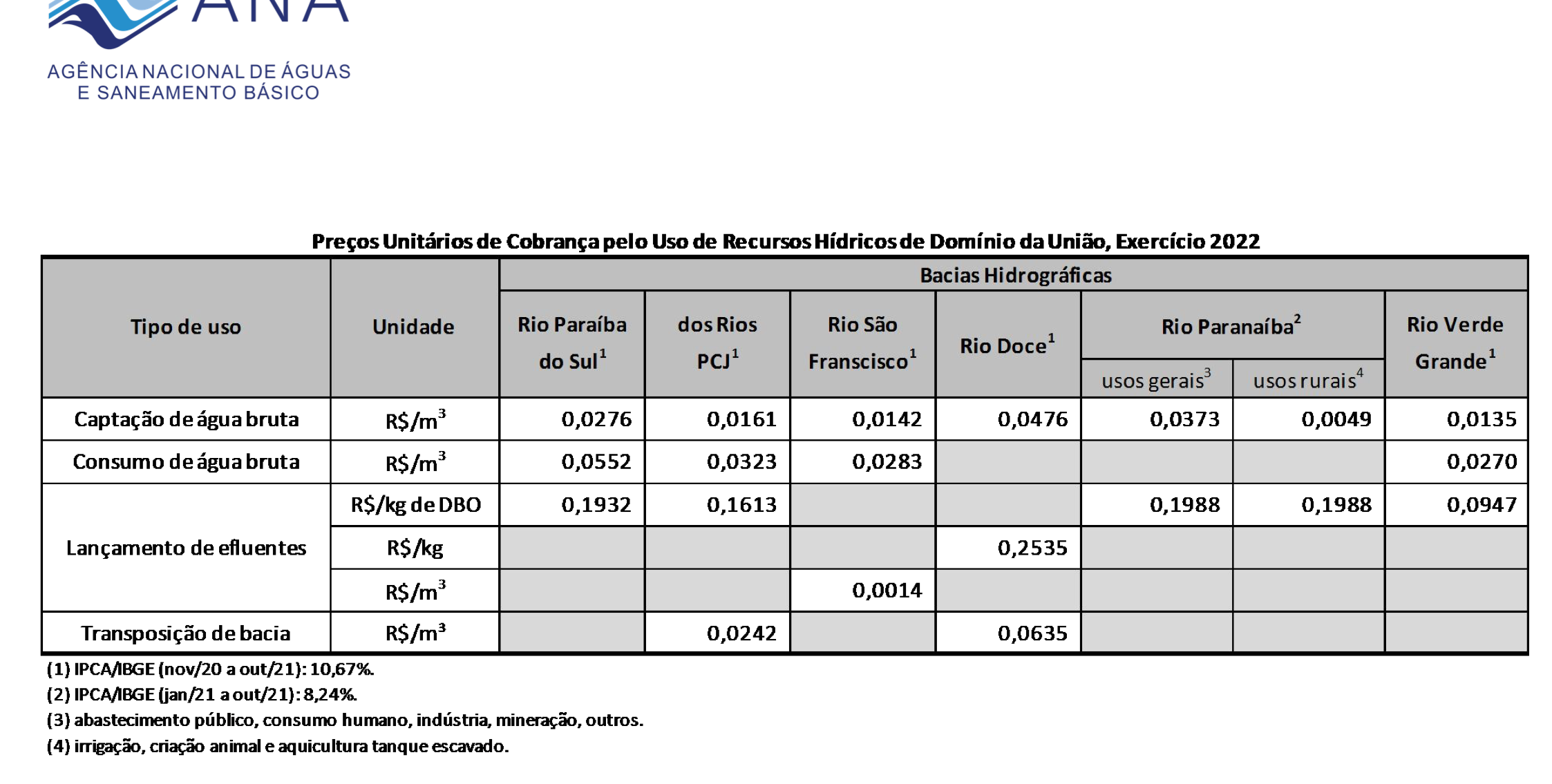 Conforme Nota Informativa ANA nº 17/2021/CSCOB/SAS que estabelece o preço de água bruta para bacias interestaduais, os valores para cobrança pelo uso de recursos hídricos de domínio da União para o exercício 2022 são: