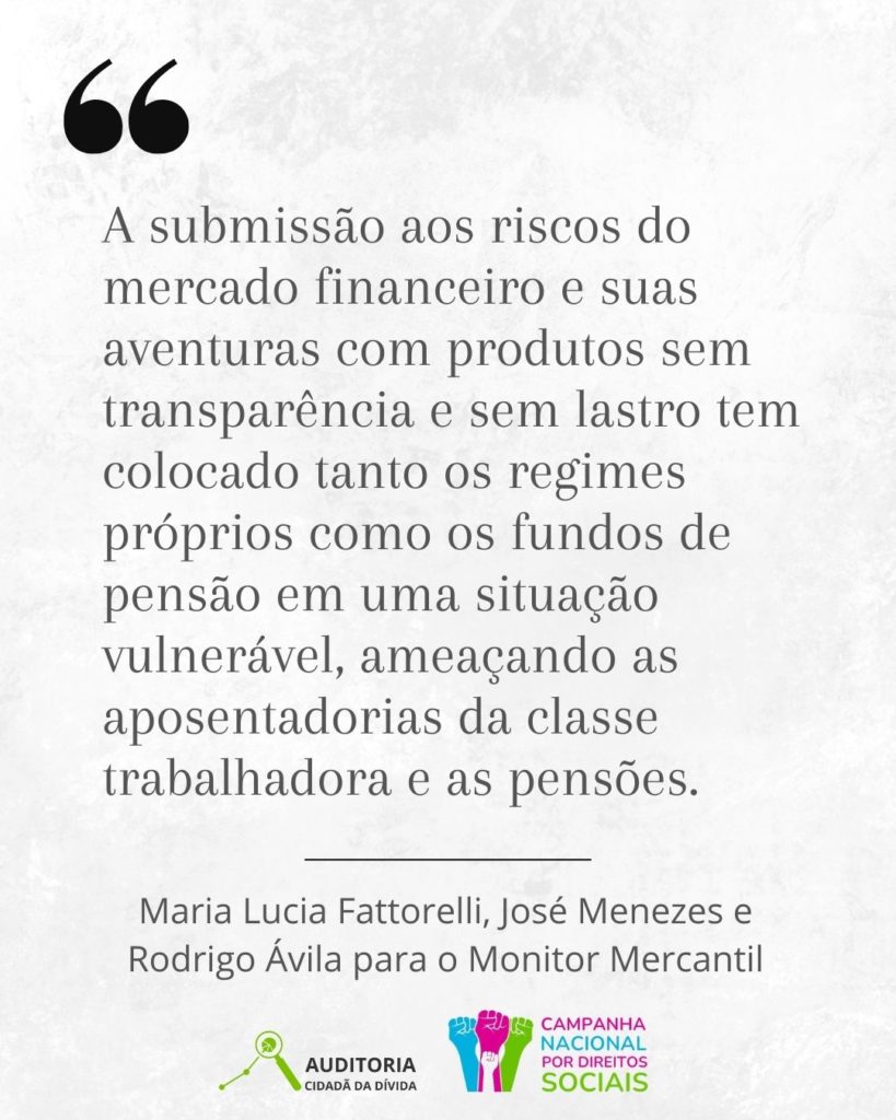 “A submissão aos riscos do mercado financeiro e suas aventuras com produtos sem transparência e sem lastro tem colocado tanto os regimes próprios como os fundos de pensão em uma situação vulnerável, ameaçando as aposentadorias da classe trabalhadora e as pensões”.