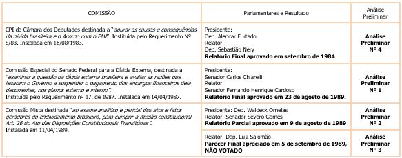 [12] Ver resumo de outras comissões do Congresso Nacional, objeto de Análise Preliminar 1 a 4 da atual CPI da Dívida Pública
