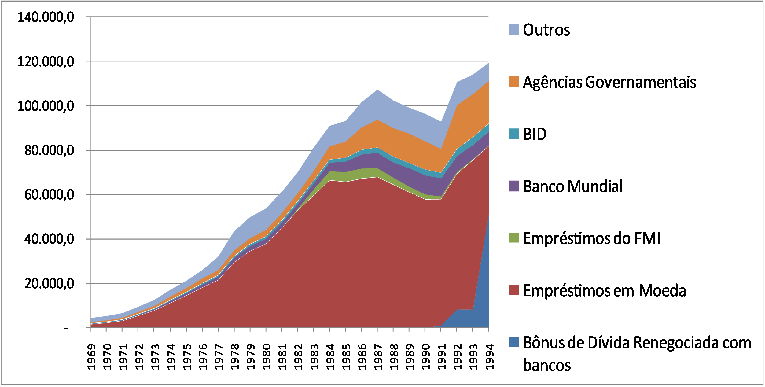- Dados completos dados estatísticos segregados por tipo de dívida externa (Multilateral, Bilateral, Comercial e Privada)[9] desde 1970 – correspondentes aos ingressos e pagamentos de juros e amortizações. Cabe mencionar que diversas tabelas contendo dados publicados pelo Banco Central, inseridas no livro “Dívida Externa e Política Econômica”, de autoria do Prof. Paulo Davidoff Cruz (Instituto de Economia da UNICAMP, 1999), demonstram que o Banco Central possui dados detalhados sobre a dívida externa desde a década de 70.