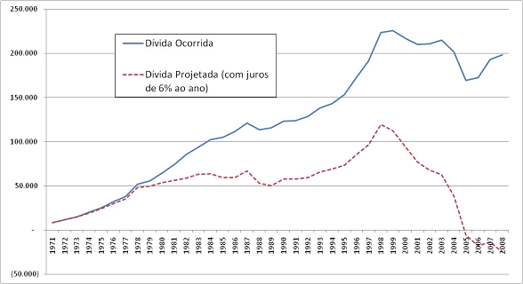 “… A diferença, porém, é que o impacto dos juros sobre juros elevou a dívida bruta de US$43,5 bilhões em fins de 1978 para US$70,2 bilhões em dezembro de 1982. A contrapartida real de bens e serviços não-fatores nesse período foi de apenas 14,9 bilhões de dólares, como veremos em seguida.” (Página 9 – grifo nosso)