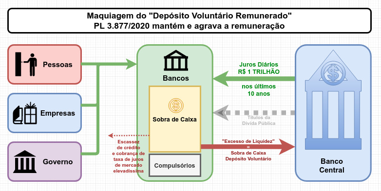 - O pagamento da remuneração injustificada e ilegal aos bancos passa a ser uma obrigação “legal”, pois o PL 3.877/2020 torna o Banco Central obrigado, por lei, a remunerar o que os bancos quiserem depositar junto ao BC!