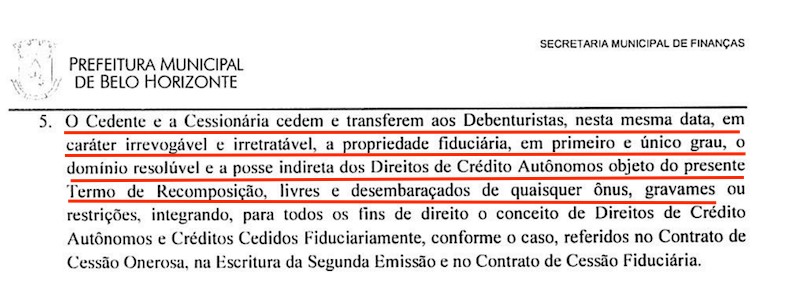 • Certificar que V.Exa. tomou conhecimento dos documentos que comprovam o comprometimento do Município de Belo Horizonte com a concessão de robusta garantia pública à operação de “securitização de créditos públicos” por meio da alienação fiduciária de seu fluxo de arrecadação tributária (em procedimento semelhante a um empréstimo consignado), garantia essa reforçada ainda mais pelo compromisso com a recomposição do referido fluxo financeiro, em qualquer circunstância, de forma irretratável e irrevogável;