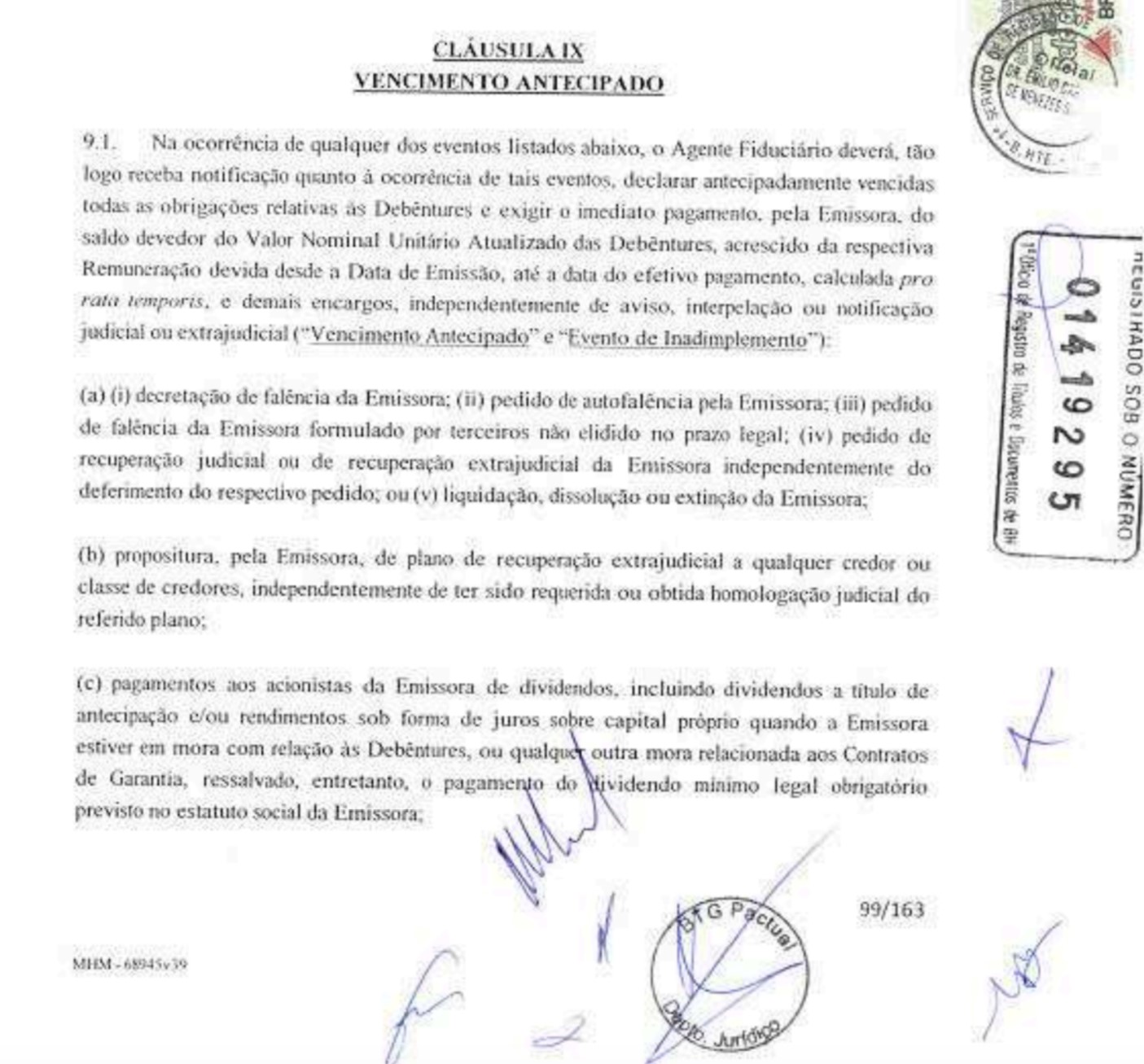 1. A Cláusula 9.1 do Contrato de Cessão Onerosa (corresponde ao Contrato de Cessão e Aquisição de Direito Autônomo de recebimento de crédito e outras Avenças, disponível em: https://drive.google.com/file/d/0B2C5anVcaxp5SVVEOXhlNWlOdDQ/edit?resourcekey=0-BOCpHMxnI9PkB8XjeIRYJg) é um verdadeiro tratado de rendição do Município ao referido contrato, prevendo antecipação do vencimento das debêntures e todos os respectivos encargos, caso se verifique qualquer um dos fatos elencados nas letras “a “ a “z”, assumindo, mais uma vez, o Município de Belo Horizonte, a completa garantia da operação, tendo em vista que todos os pagamentos das debêntures sênior são efetuados com recursos do fluxo de arrecadação fiduciariamente alienado ao investidor que adquiriu as debêntures sênior: