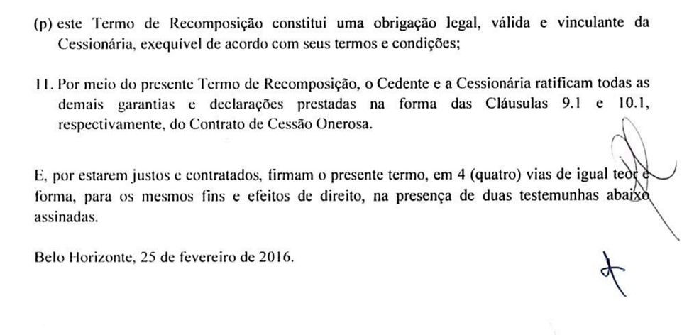 1. A cláusula 5 do TERMO DE RECOMPOSIÇÃO, de 25/02/2016 (disponível em https://drive.google.com/file/d/0B8OTOor5lxGDRG9LS0N5VGdiY00/view?resourcekey=0-vxoR-nXGgy-wnTXuGBHXbg), merece atenção especial porque atesta que o valor de mais de R$ 28,5 milhões, recomposto naquela data, foi cedido diretamente ao banco BTG Pactual, conforme demonstra o fac-símile abaixo: