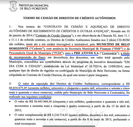 1. Atente-se para o fato de o Município de Belo Horizonte ter-se obrigado a efetuar, em caráter irrevogável e irretratável, a recomposição do valor do fluxo de arrecadação de créditos tributários, fiduciariamente alienado à instituição financeira que adquiriu as debêntures sênior (banco BTG Pactual S/A). Durante o seu percurso pela rede bancária e antes de alcançar os cofres públicos, esse fluxo financeiro passou a ser desviado para as “contas vinculadas” a essa arquitetura financeira, de gestão exclusiva das instituições financeiras envolvidas na operação. O “Termo de Cessão de Direitos de Crédito Autônomos”, de 18/05/2015, acompanhado de planilhas de valores que detalham as parcelas, comprova a realização de uma RECOMPOSIÇÃO DE VALORES no montante de R$ 60.654.675,45 (sessenta milhões, seiscentos e cinquenta e quatro mil, seiscentos e setenta e cinco reais e quarenta e cinco centavos), conforme trecho ilustrativo a seguir: (vide documento completo em: https://drive.google.com/file/d/0B8OTOor5lxGDbjNVM1NQSDVBQlk/view?resourcekey=0-V9RFJ6SLB6X2MZsDNa4Ugg)