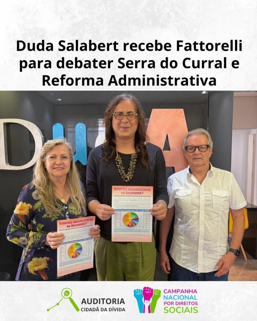 Na reunião, Fattorelli apresentou à deputada o novo folheto da ACD sobre a chamada Reforma Administrativa, alertando sobre o perigo do desmonte de serviços públicos que a PEC 38/2025 esconde, sob uma falsa promessa de eficiência que tem como origem: supressão de cargos, fim de estabilidade, possibilidade de demissão de servidores e terceirização; privatizações, entre outras medidas que podem esfacelar os serviços públicos essenciais. Tais premissas têm como base documentos do Banco Mundial e do Banco Interamericano de Desenvolvimento (BID), que estão por trás da proposta da Reforma, comentou Fattorelli.