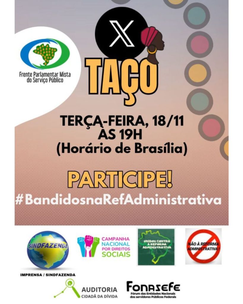🐦 É hora de ocupar o X, antigo Twitter, com as frases da campanha #BandidosnaRefAdministrativa, marcando parlamentares e pressionando o Congresso a barrar este ataque ao serviço público.