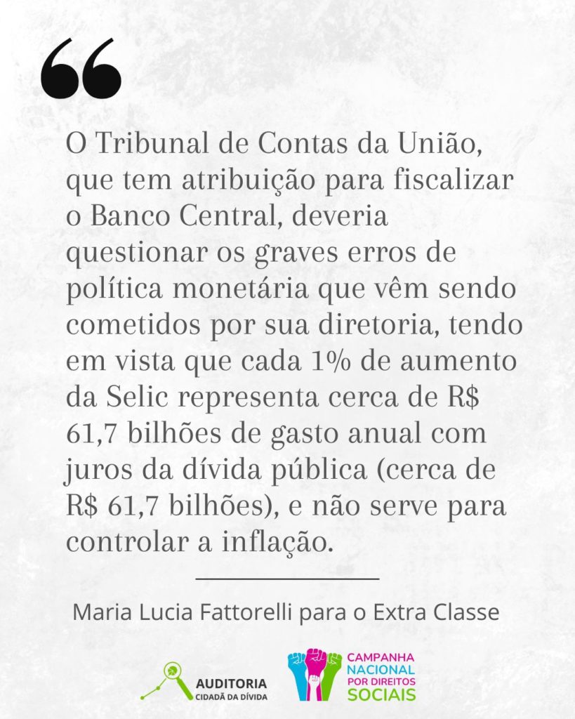 A frase da imagem integra o artigo “Juros exorbitantes: a esquizofrenia do Banco Central e dos analistas financeiros”, assinado por Maria Lucia Fattorelli, coordenadora nacional da Auditoria Cidadã da Dívida (ACD), publicado no Extra Classe. No texto, Fattorelli questiona a insistência do Banco Central em manter a taxa Selic nas alturas, mesmo com a inflação oficial dentro da meta, alertando que cada 1% de aumento dos juros representa cerca de R$ 61,7 bilhões a mais por ano em gastos com juros da dívida pública, sem efeito real no controle da inflação e com enormes impactos sociais e fiscais.
