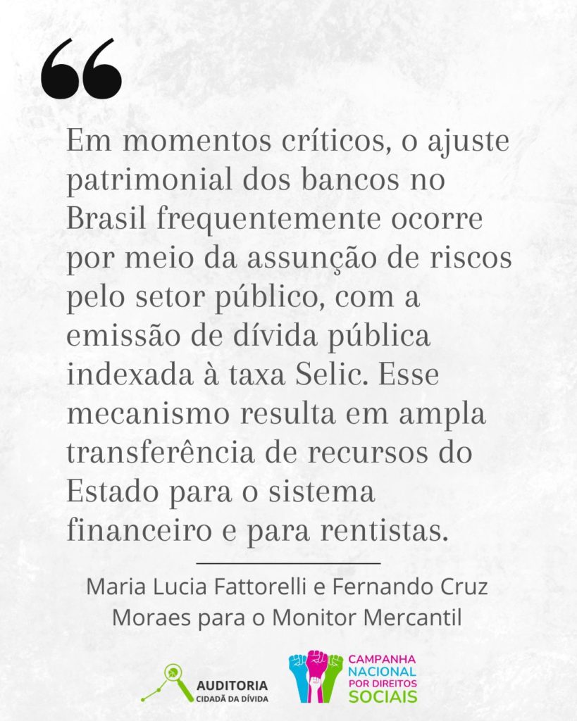 “Em momentos críticos, o ajuste patrimonial dos bancos no Brasil frequentemente ocorre por meio da assunção de riscos pelo setor público, com a emissão de dívida pública indexada à taxa Selic. Esse mecanismo resulta em ampla transferência de recursos do Estado para o sistema financeiro e para rentistas”.