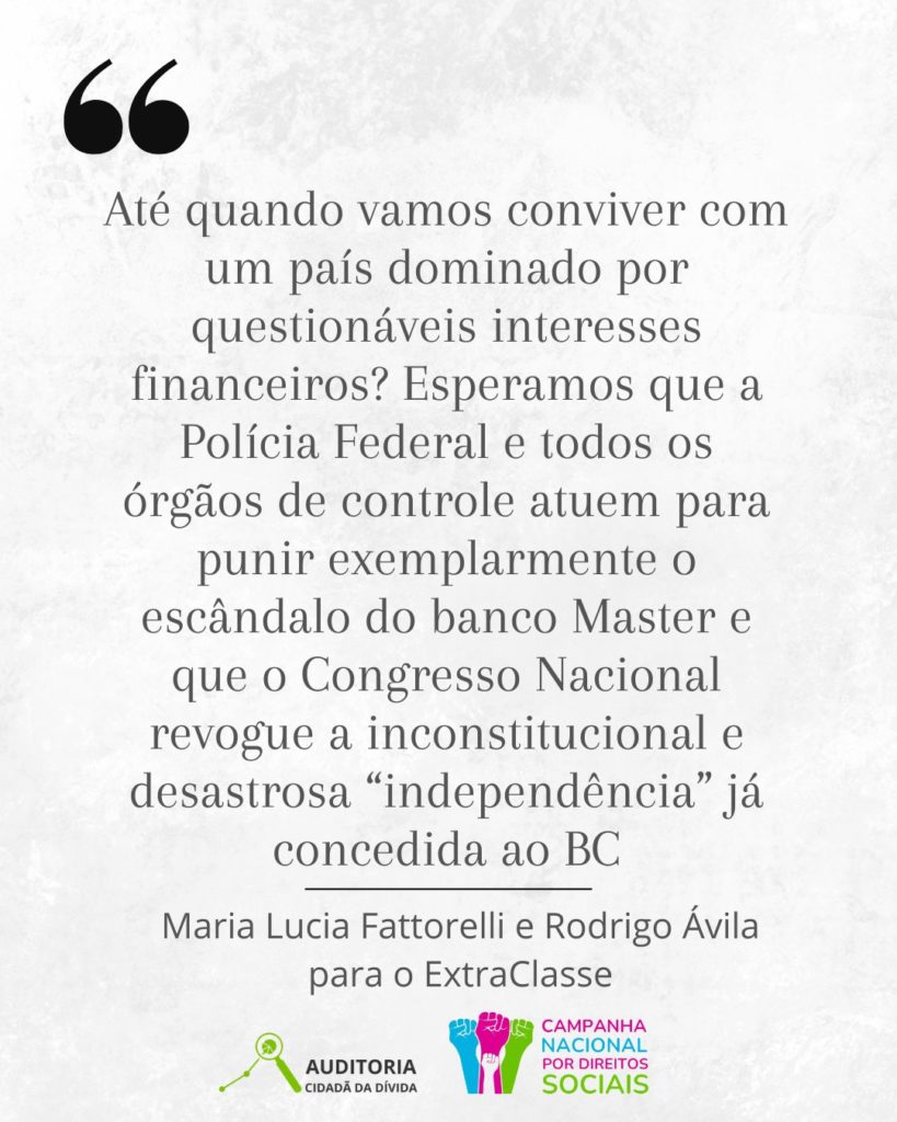No artigo “Caso de polícia: gastamos mais de R$ 2 trilhões com o Sistema da Dívida em 2025”, a coordenadora nacional da Auditoria Cidadã da Dívida, Maria Lucia Fattorelli, e do economista da entidade, Rodrigo Ávila, questionam: Até quando vamos conviver com um país dominado por questionáveis interesses financeiros?