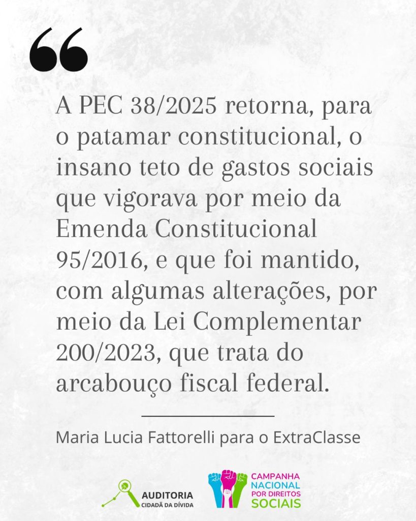 “A PEC 38/2025 retorna, para o patamar constitucional, o insano teto de gastos sociais que vigorava por meio da Emenda Constitucional 95/2016, e que foi mantido, com algumas alterações, por meio da Lei Complementar 200/2023, que trata do arcabouço fiscal federal”, diz.