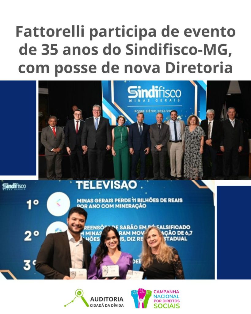 A programação incluiu a entrega do 1º Prêmio Sindifisco-MG de Comunicação. A coordenadora nacional da Auditoria Cidadã da Dívida, Maria Lucia Fattorelli, participou da cerimônia e integrou o júri convidado para avaliar as 86 peças jornalísticas inscritas, contribuindo para o processo coletivo de atribuição de notas que definiu os trabalhos premiados.