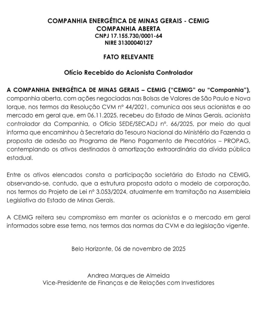 Estes 20% iniciais seriam pagos por meio da entrega de fatias de empresas como a Cemig (Companhia Energética de Minas Gerais), conforme o comunicado de “Fato Relevante” (segunda imagem do carrossel ou abaixo da notícia no site), a Codemge (Companhia de Desenvolvimento de Minas Gerais), mais fluxos futuros de arrecadação e muito patrimônio. Além do mais, na quarta (5/11) o governo conseguiu aprovar a Proposta de Emenda à Constituição (PEC) que dispensa a realização de plebiscito para a privatização da Copasa (Companhia de Saneamento de Minas Gerais), que também deve servir para pagar essa dívida. Mas que dívida?