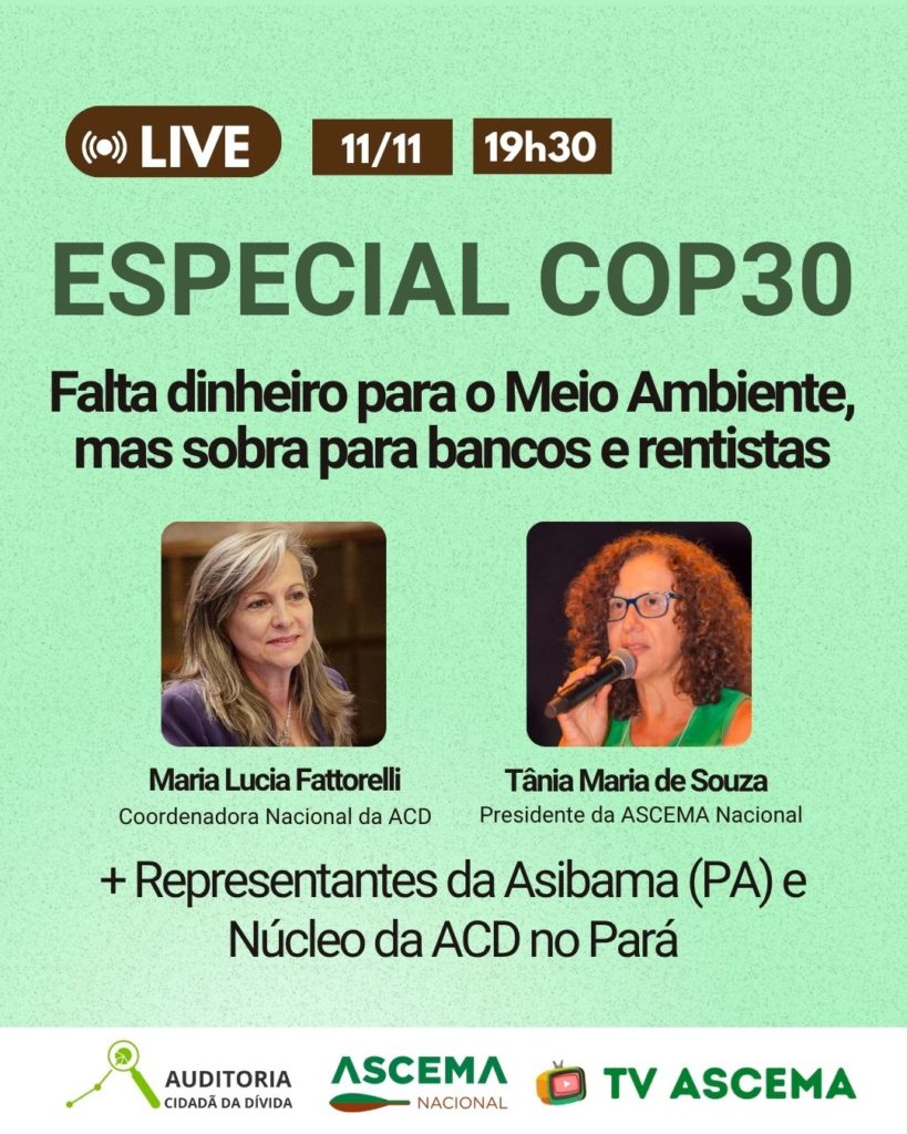 Na próxima terça-feira (11/11), às 19h30, a Auditoria Cidadã da Dívida (ACD) e a ASCEMA Nacional realizam uma live conjunta como parte da estratégia de ações integradas das entidades para a Cúpula dos Povos e a COP30, que acontecem a partir da próxima semana em Belém (PA).