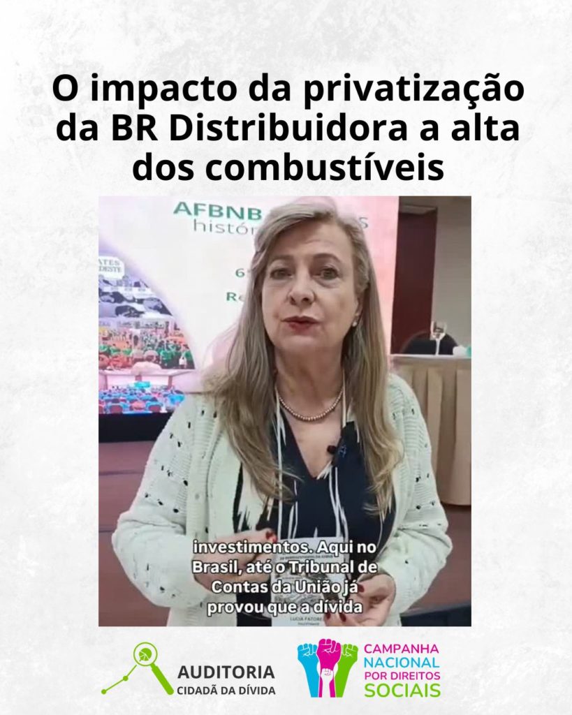 Em entrevista concedida por Maria Lucia Fattorelli à AFBNB, a coordenadora nacional da Auditoria Cidadã da Dívida (ACD) fala como as privatizações de estatais estratégicas, entregues a empresas privadas para que sobre mais dinheiro para o Sistema da Dívida, impactam negativamente o Brasil. No trecho, ela conta como a privatização da BR Distribuidora reflete diretamente na atual alta dos combustíveis.