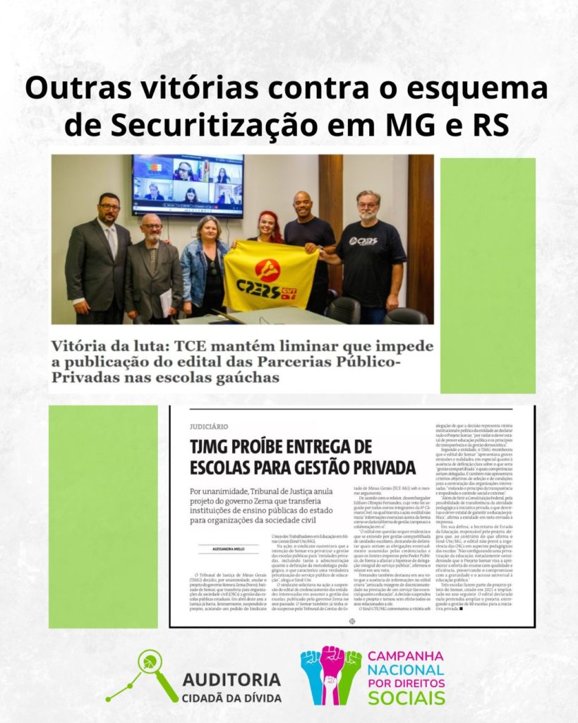 Depois da vitória no RJ (leia aqui), as duas notícias que ilustram esse post mostram que o avanço da Financeirização nas PPP’s da Educação, onde há muitos recursos (como dinheiro do Fundeb, e apoio do BNDES para essas PPP’s), foi barrado pelo Tribunal de Justiça de Minas Gerais (TJMG) e pelo Tribunal de Contas do Estado do Rio Grande do Sul (TCE-RS).