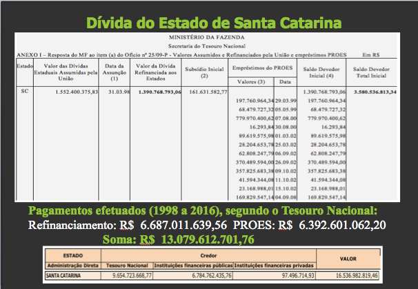 A título exemplificativo, mostramos os dados do Estado de Santa Catarina, cujo Saldo Devedor Total Inicial refinanciado pela União era R$ 3,58 bilhões (incluindo o PROES) no final da década de 90. Até 2016, o Estado de SC pagou R$6,69 bilhões do refinanciamento e R$6,39 do PROES, somando portanto pagamento de R$13,08 bilhões até 2016, ou seja, pagou mais de 3 vezes o valor total refinanciado. Apesar disso, em 2018 a dívida do Estado de SC somava R$16,54 bilhões em 2018, ou seja, quase 5 vezes o valor refinanciado: