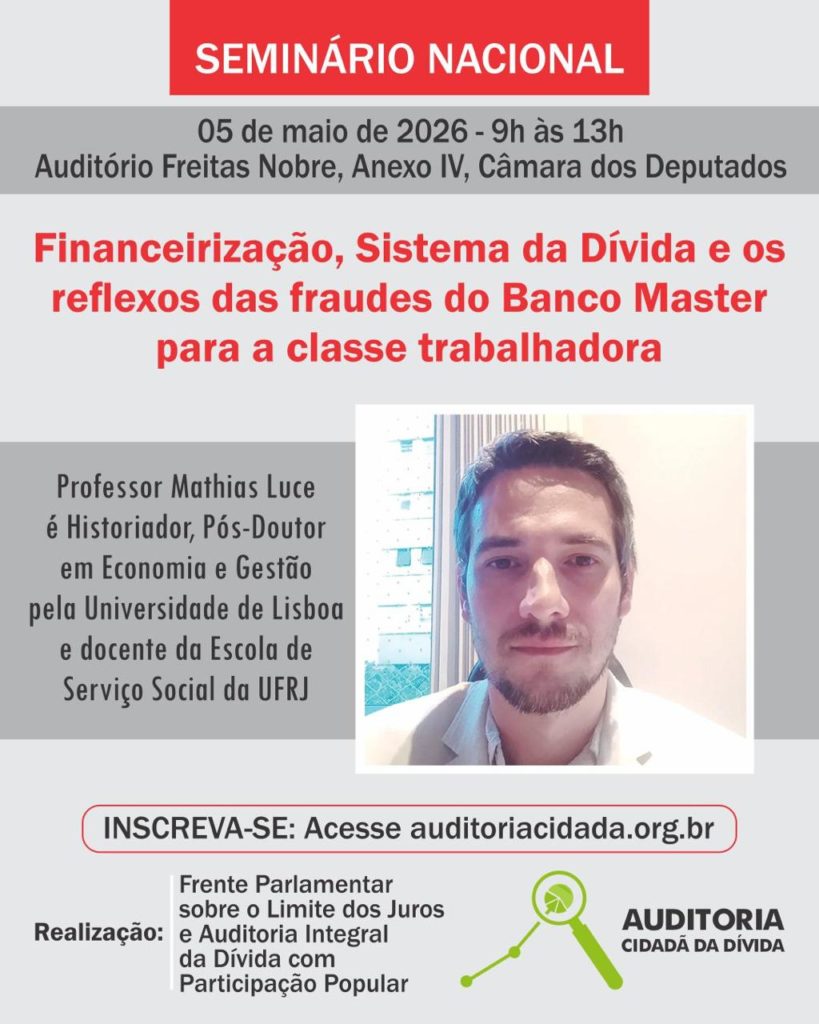 O professor será um dos palestrantes do seminário “Financeirização, sistema da dívida e os reflexos das fraudes do Banco Master para a classe trabalhadora”, que reunirá especialistas para aprofundar esse debate.
