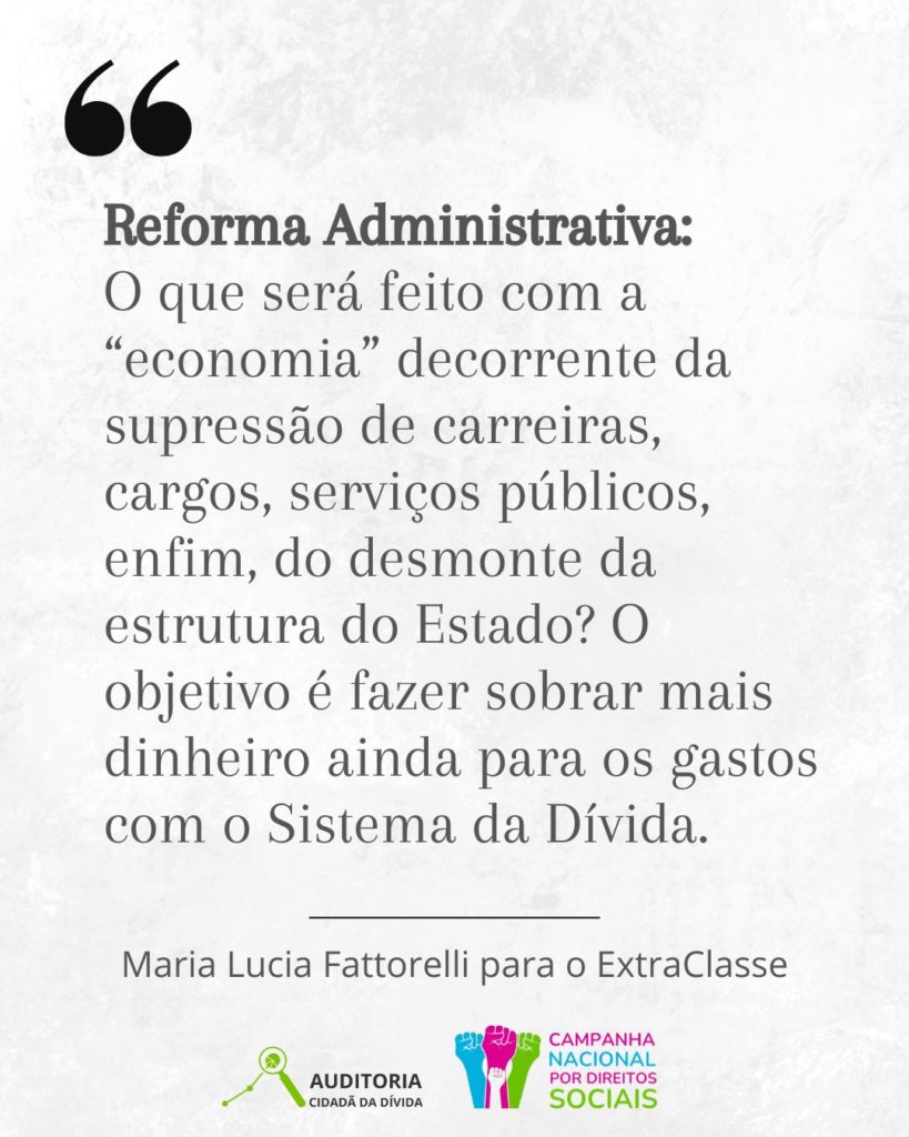 “O que será feito com a “economia” decorrente da supressão de carreiras, cargos, serviços públicos, enfim, do desmonte da estrutura do Estado? O objetivo é fazer sobrar mais dinheiro ainda para os gastos com o Sistema da Dívida”, comentou.
