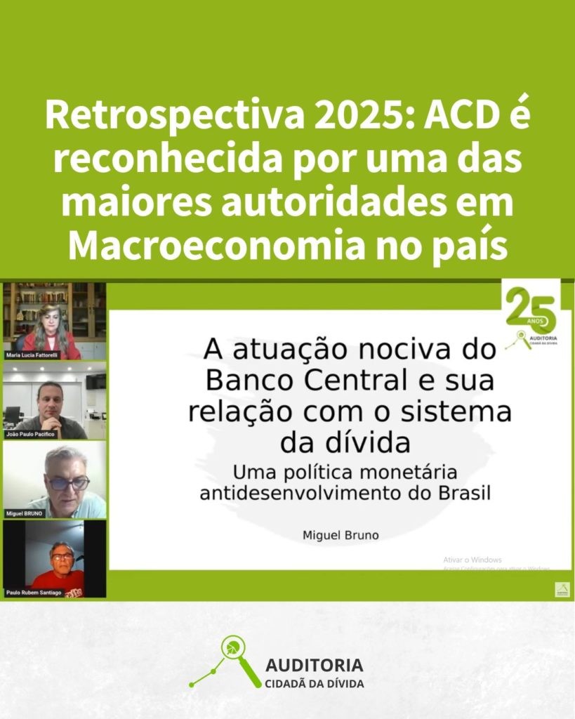 A Auditoria Cidadã da Dívida (ACD) recebeu o reconhecimento de uma das maiores autoridades em macroeconomia do país, o professor Miguel Bruno, doutor pela EHESS de Paris e pela UFRJ, pesquisador da UERJ, IBGE e Faculdade Mackenzie. Durante participação em live comemorativa dos 25 anos da ACD, dia 22/09, o economista destacou a relevância científica e social do trabalho desenvolvido pela entidade e contestou críticas que considera infundadas.