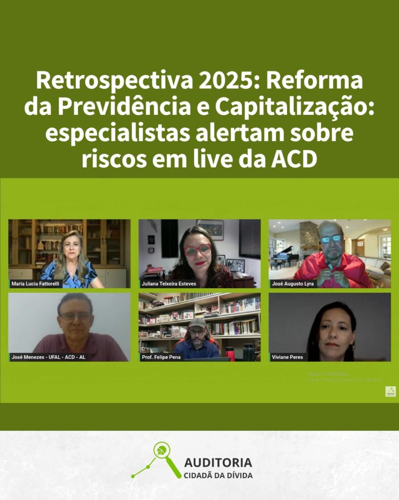 Na noite de 8 de setembro, a Auditoria Cidadã da Dívida (ACD) reuniu especialistas para debater “O Sistema da Dívida e a reiterada ameaça à Previdência Social”, em mais uma atividade alusiva aos seus 25 anos. O encontro virtual destacou como as reformas da Previdência, a precarização do trabalho e os fundos de capitalização integram uma engrenagem que prioriza o pagamento de juros em detrimento dos direitos sociais.