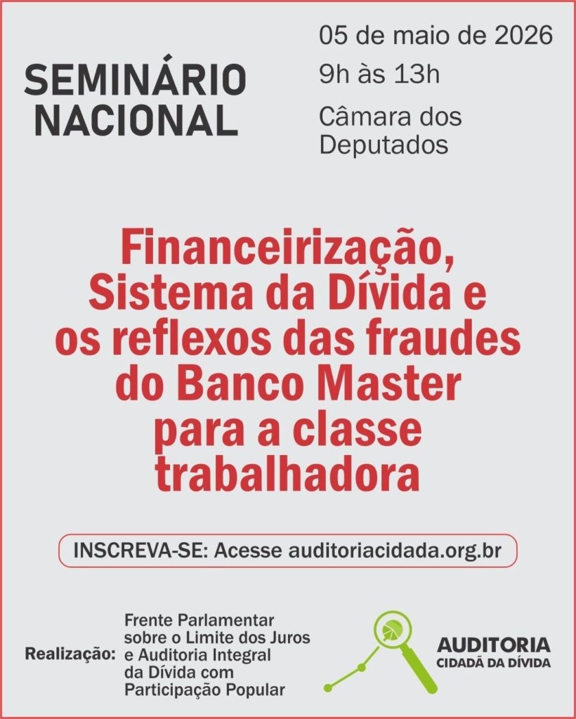 A Auditoria Cidadã da Dívida e a Frente Parlamentar pelo Limite dos Juros e Auditoria Integral da Dívida Pública convidam movimentos sociais, entidades, sindicatos, coletivos, estudantes e toda a cidadania comprometida com a justiça social a participarem do seminário “Financeirização, Sistema da Dívida e os reflexos das fraudes do Banco Master para a classe trabalhadora”.