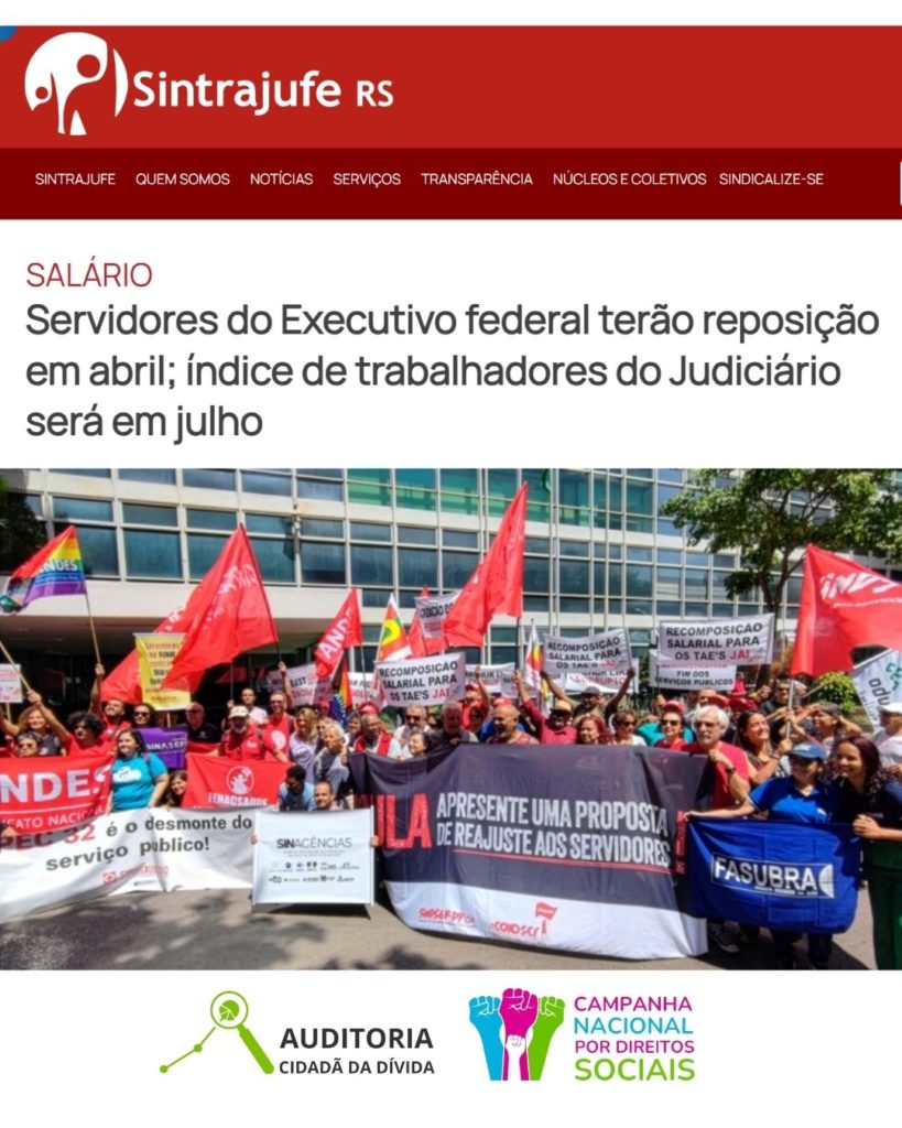 A Campanha Nacional por Direitos Sociais repercute informação divulgada originalmente no site do Sintrajufe-RS sobre a reposição salarial dos servidores públicos federais. Segundo a publicação, os servidores e servidoras do Executivo federal terão reajuste salarial a partir de abril de 2026, resultado de acordos firmados com o Ministério da Gestão e da Inovação em Serviços Públicos ainda em 2024. Os reajustes, que incidem sobre a remuneração total, incluindo gratificações, somam 9% em janeiro de 2025 e 5% em abril de 2026, garantindo ganho real no período de 2023 a 2026 após quatro anos de congelamento salarial.