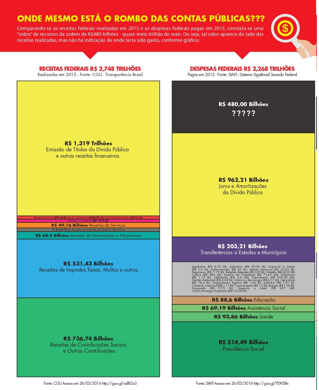Esse comparativo de dados oficiais evidencia que em 2015 tivemos uma sobra de recursos da ordem de R$ 480 bilhões, cuja aplicação é desconhecida.